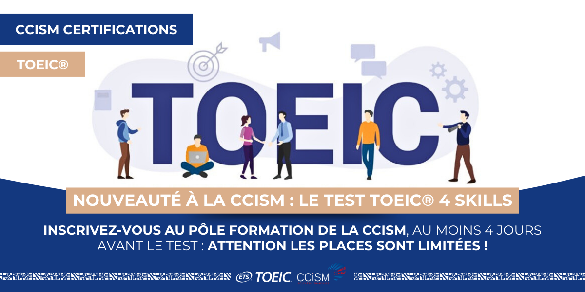 Évaluez vos compétences en anglais professionnel (oral et écrit) avec la certification TOEIC® 4 Skills, désormais disponible à la CCISM. Le test TOEIC® 4 Skills valide les compétences linguistiques requises par les entreprises et les institutions académiques, et vous permet de vous démarquer sur le marché du travail.