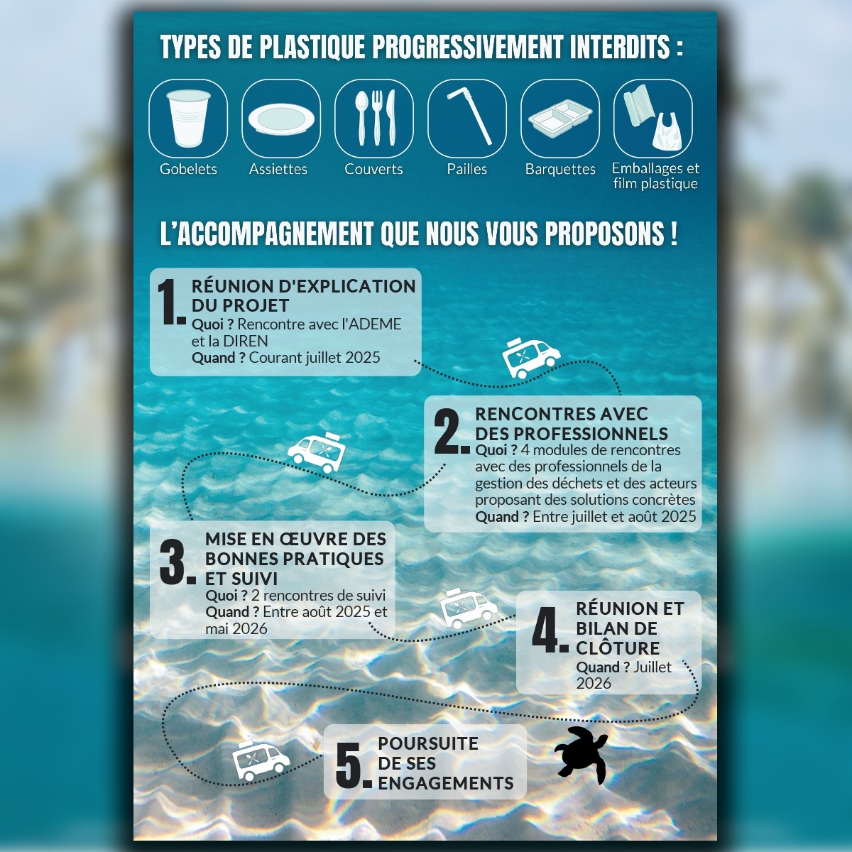 - Des rencontres avec des experts locaux : ADEME Polynésie française, Direction de l'Environnement, Syndicat FENUA MA, Nana sac plastique et la CCISM, partenaire actif de cette démarche