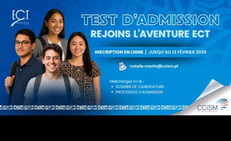 Bachelier et étudiant post-BTS tente ta chance à la dernière session du concours d’entrée. Formations en modules innovants, numérique, économie. L’École de Commerce de Tahiti prépare à relever les défis du monde professionnel.