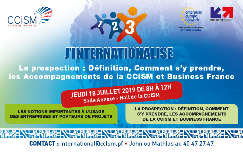 La prochaine session 1, 2, 3 J'internationalise aura lieu le jeudi 18 juillet 2019, de 8h à 12h en salle annexe, dans le hall de la CCISM.