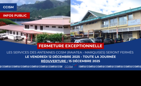 Tous les services des antennes CCISM (Raiatea et Marquises) seront exceptionnellement fermés le vendredi 12 décembre 2025, toute la journée.