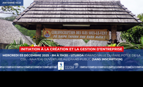 La CCISM et la Circonscription des Iles-Sous-Le-Vent, en partenariat avec la Commune de Bora Bora, organisent une initiation à la création et la gestion d’entreprise à destination de tous les porteurs de projet, le mercredi 3 décembre 2025, de 8h à 11h30, dans la grande salle du Fare potee de la Circonscription des ISLV, à Uturoa (Raiatea).