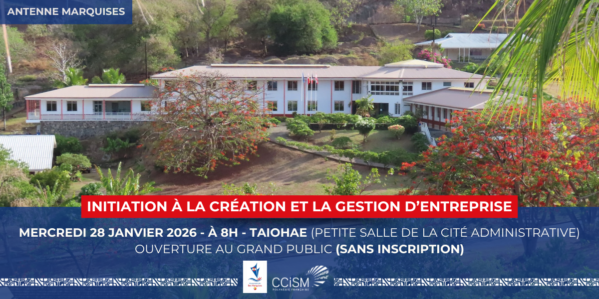 La CCISM et la Circonscription des Iles Marquises, organisent une initiation à la création et la gestion d’entreprise à destination de tous les porteurs de projet, le mercredi 28 janvier 2026, à 8h, dans la petite salle de la Cité administrative de Taiohae (Marquises).
