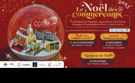Cette année encore, la magie de Noël s’installe dans nos centres-villes ! La CCISM, aux côtés de EDT, CEGELEC, la DEQ, le Port Autonome, la Ville de Papeete et des associations de commerçants de Papeete, Uturoa, Punaauia, de la Cathédrale et de Taravao, vous prépare un mois de décembre exceptionnel.