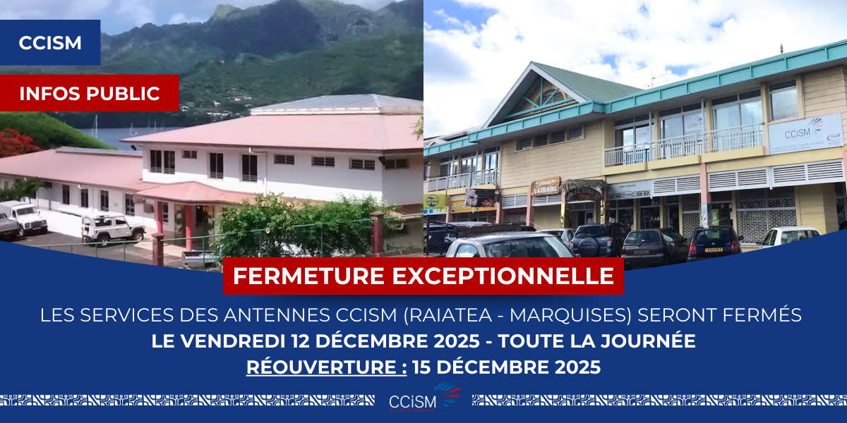 Tous les services des antennes CCISM (Raiatea et Marquises) seront exceptionnellement fermés le vendredi 12 décembre 2025, toute la journée.