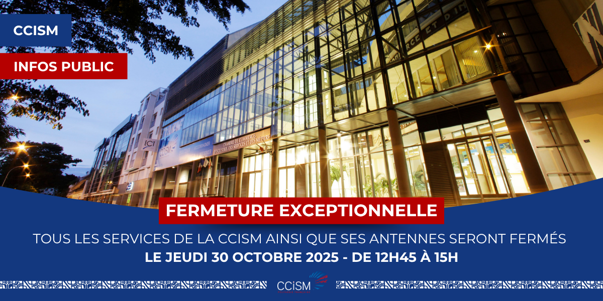 Tous les services de la Chambre de commerce (CCISM), ainsi que ses antennes, seront exceptionnellement fermés le Jeudi 30 octobre 2025 de 12h45 à 15h.