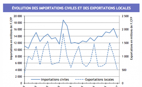 En janvier 2017, la valeur des importations civiles progresse de 14 % par rapport à janvier 2016 tirée par le volume des importations de biens intermédiaires. La valeur des exportations locales diminue de 14 % entre janvier 2016 et janvier 2017, notamment du fait de l’absence d’exportation de « trocas » (espèce trochus niloticus).
