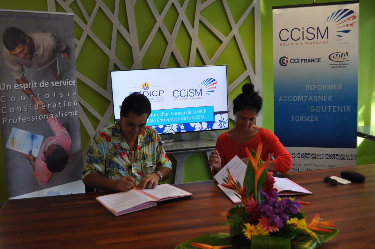 Cette inauguration vient matérialiser la convention de partenariat signée par Madame Claude PANERO, Directrice de la DICP et Monsieur Stéphane CHIN LOY, Président de la CCISM de Polynésie française qui a pour objectif d’améliorer l’information et l’accompagnement des entreprises et porteurs de projet en intégrant les formalités fiscales liées à la création d’entreprise au sein du parcours du Pôle Entreprises de la CCISM.